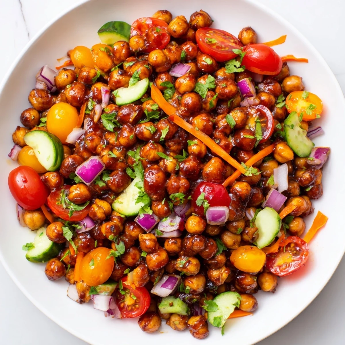This salad is endlessly forgiving, which is part of why I keep coming back to it. If you want extra crunch, scatter roasted sunflower seeds or pumpkin seeds over the top just before serving—they add a nutty richness that plays well with the smoky chickpeas. Swap the cilantro for parsley if that's what you have, or try half and half for a more complex herb flavor. For a creamier version, add chunks of avocado or a dollop of yogurt on the side. And if heat is your thing, grab a spicy BBQ sauce instead of the mild version, or stir in a pinch of cayenne pepper to the dressing.