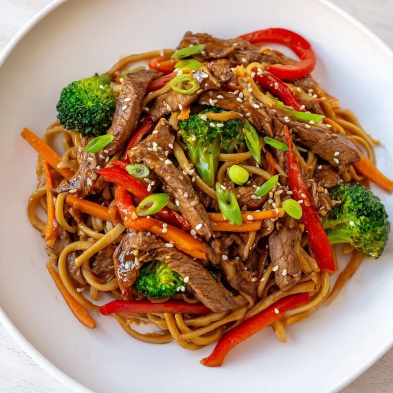 Pin A quick and flavorful dish featuring tender beef strips, crisp vegetables, and chewy lo mein noodles tossed in a savory sauce—perfect for busy weeknights.