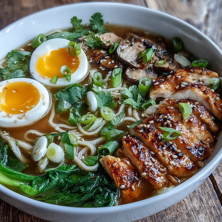 Store the broth, noodles, chicken, and toppings separately in airtight containers in the fridge for up to three days. When you're ready to eat, reheat the broth gently on the stove, warm the chicken in a skillet or microwave, and pour the hot broth over fresh or briefly reheated noodles. The eggs and fresh toppings should be added right before serving so they stay vibrant and don't get soggy or discolored.