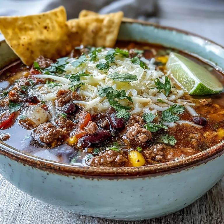 Pin My neighbor stopped by on a random Tuesday evening with a craving she couldn't quite name, something warm but not heavy, with that satisfying kick of spice. I had ground beef thawing and a pantry full of canned goods, so I started throwing together what felt like taco flavors in a pot. Within thirty minutes, she was on her second bowl, and I realized I'd stumbled onto something that would become a weeknight staple in both our kitchens. It's the kind of soup that tastes like it took hours but practically makes itself.