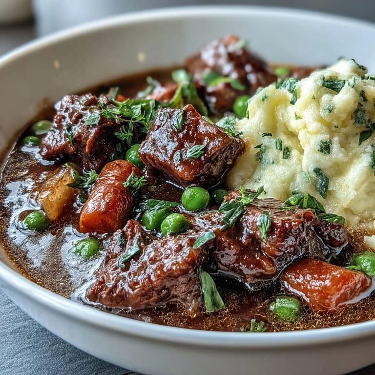 This stew tastes best served hot, ladled generously over that fluffy mash, in a bowl wide enough for spooning both together. It pairs beautifully with a light-bodied red wine—nothing heavy, just something that echoes the wine in the pot—or an Irish ale if that's more your style. A crisp salad on the side cuts through the richness without overwhelming the dish, and crusty bread for soaking up broth is never a mistake.