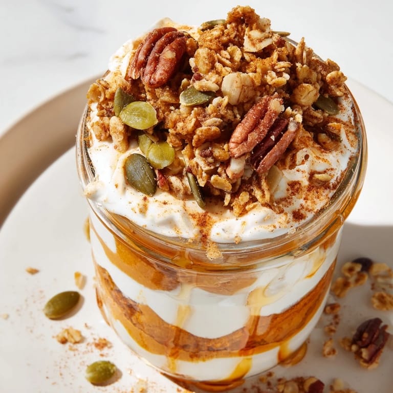 Pin I was standing in my kitchen on a chilly October morning, staring at a can of pumpkin purée I'd impulse-bought at the farmer's market, when my roommate wandered in asking what smelled so autumnal. That's when it hit me—why not layer those warm spices with something cool and creamy? Twenty minutes later, we were digging into these parfaits straight from the jar, and I realized I'd stumbled onto something that felt both indulgent and energizing, proof that the best recipes often come from standing around wondering what to make.