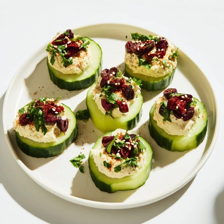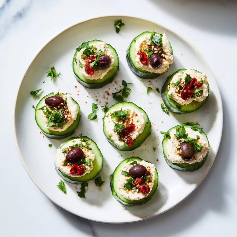 Pin Quick Hummus and Cucumber Bites offer a fresh and healthy way to impress your guests with minimal effort. Crisp cucumber rounds provide a cool, refreshing base, perfectly complemented by creamy, rich hummus. This easy-to-make Mediterranean appetizer brings vibrant colors and delightful textures together, making it ideal for parties or a light, satisfying snack anytime.