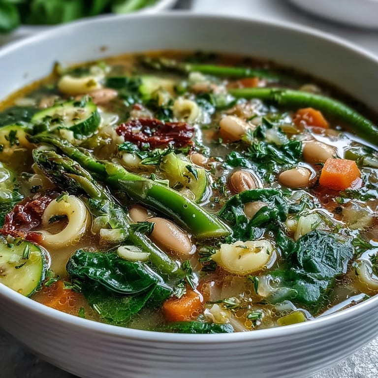 Pin There's something about April that makes me crave soup—not the heavy kind, but something bright and alive that tastes like the garden is finally waking up. I discovered this minestrone while wandering through a farmers market on an unexpectedly warm Saturday, my arms full of asparagus bunches and fresh peas still in their pods. The vendor mentioned her grandmother made something similar in Tuscany, and I became obsessed with recreating it in my own kitchen. What started as a casual conversation turned into my favorite weeknight ritual, the one where the house fills with the smell of herbs and spring vegetables all at once.