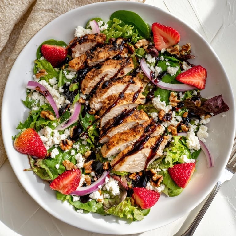 Prepare the chicken and balsamic glaze ahead, then store separately. Assemble greens, toppings, and chicken just before serving to maintain crisp texture. Add glaze moments before eating.