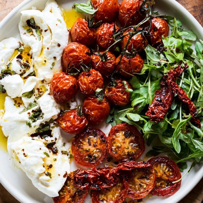 The genius of a tomato flight is in the contrast—temperature, texture, intensity, all on one plate. Fresh tomatoes are bright and clean, roasted ones are concentrated and almost jammy, and sun-dried ones are deep and funky in the best way. Together, they make each other taste better, which is honestly the whole point of any good dish. The burrata doesn't compete; it soothes, offering a cool, creamy counterpoint to the acidic fruit. When you're plating, think about rhythm—you're not trying to hide anything, just making sure every element gets noticed.
